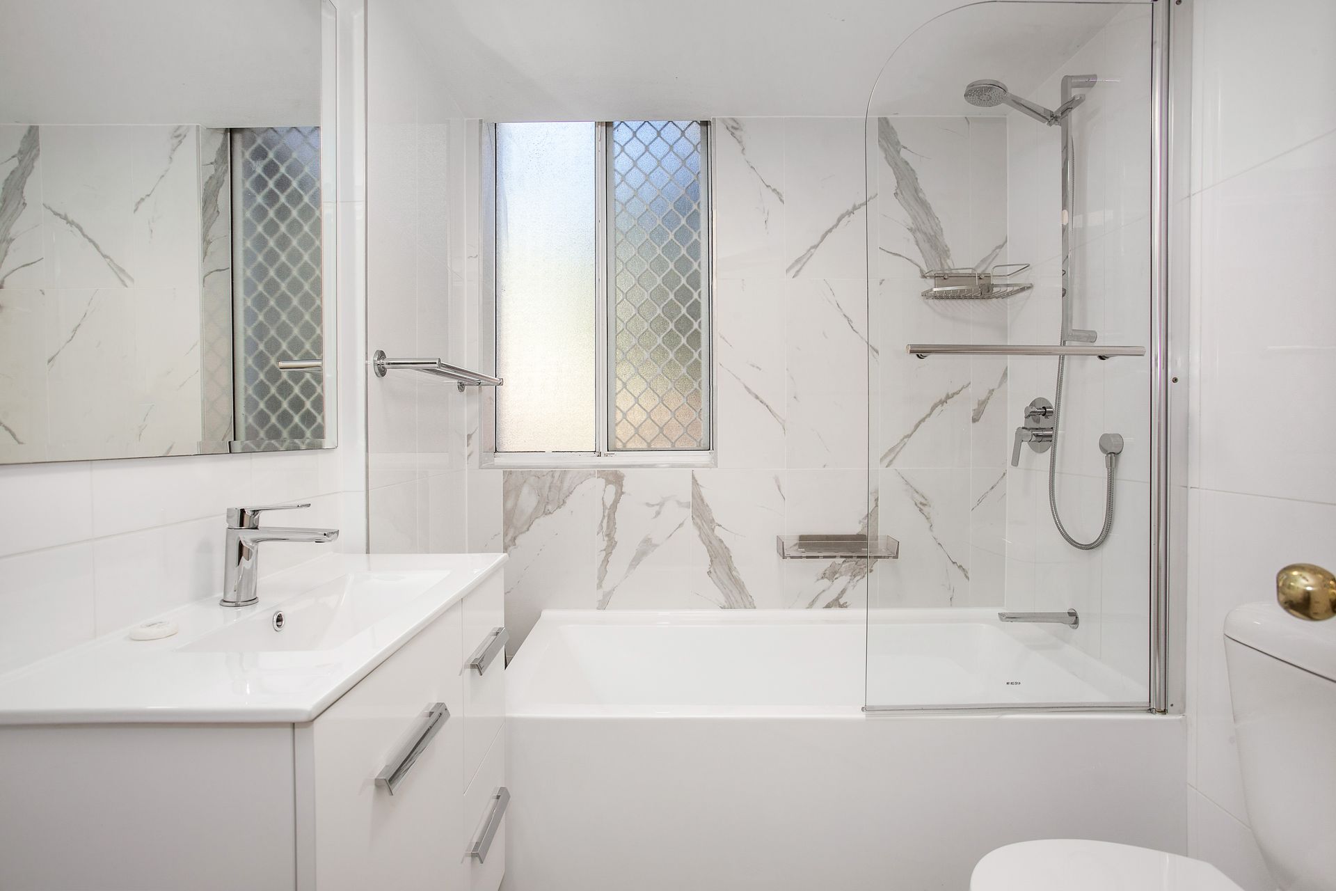 Main bathroom with shower over bath