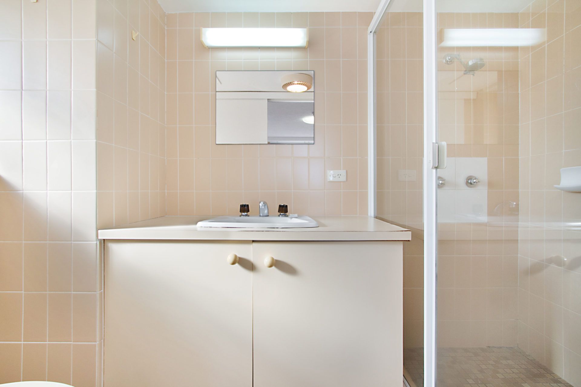Main bathroom with shower over bathtub