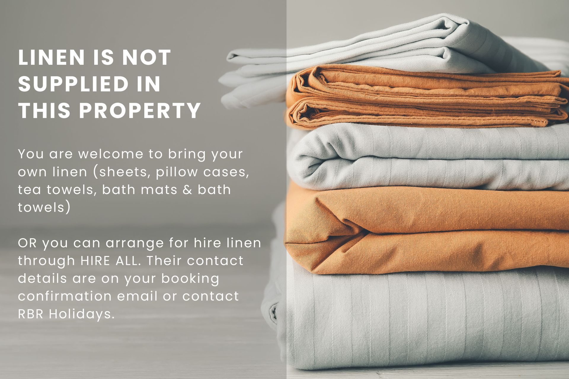 Linen is NOT included in this property. You are welcome to bring your own linen (sheets, pillow cases, tea towels, bath mats and bath towels) or it may be hired through Hire All their contact details can be found on your booking confirmation email or by contacting our office.