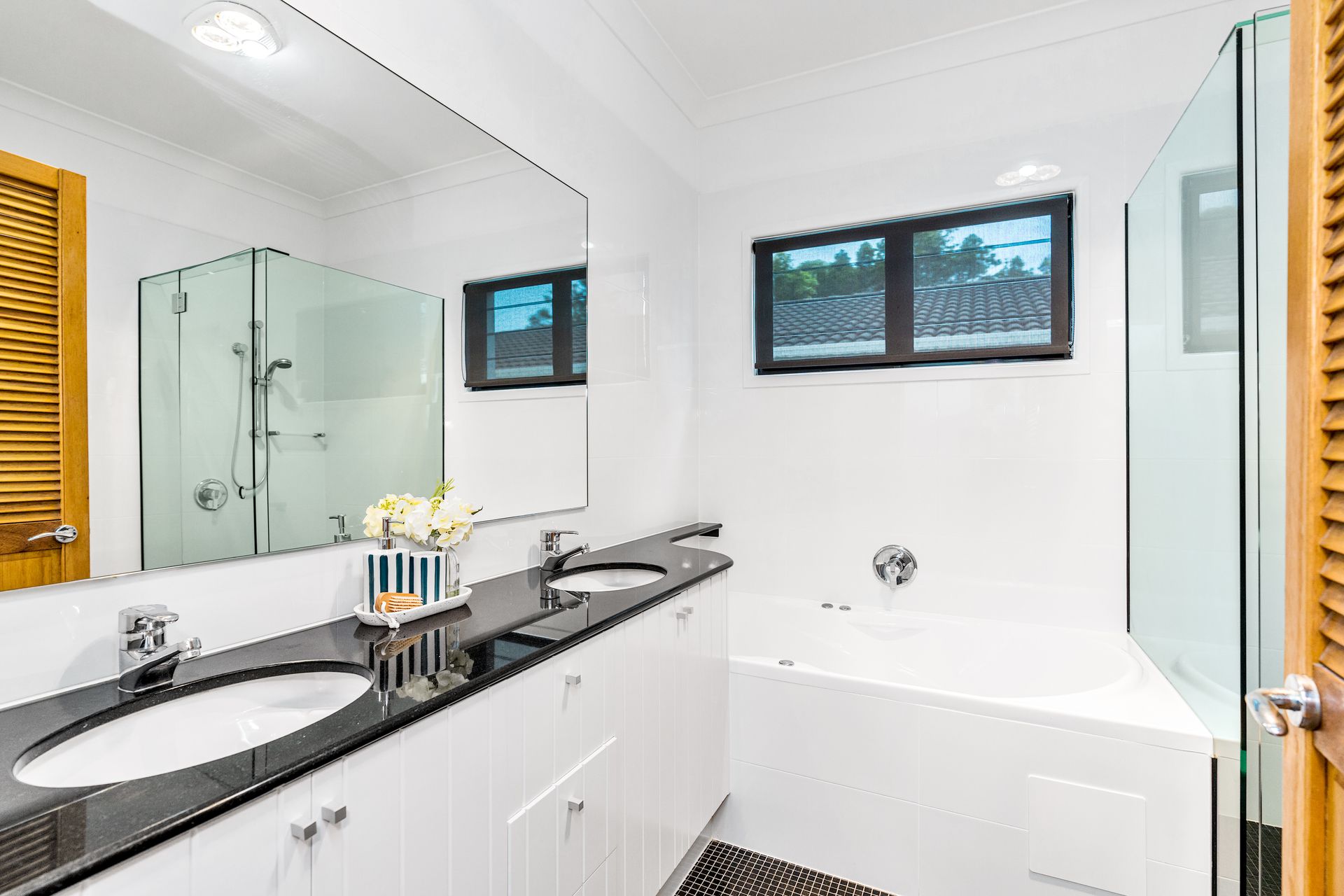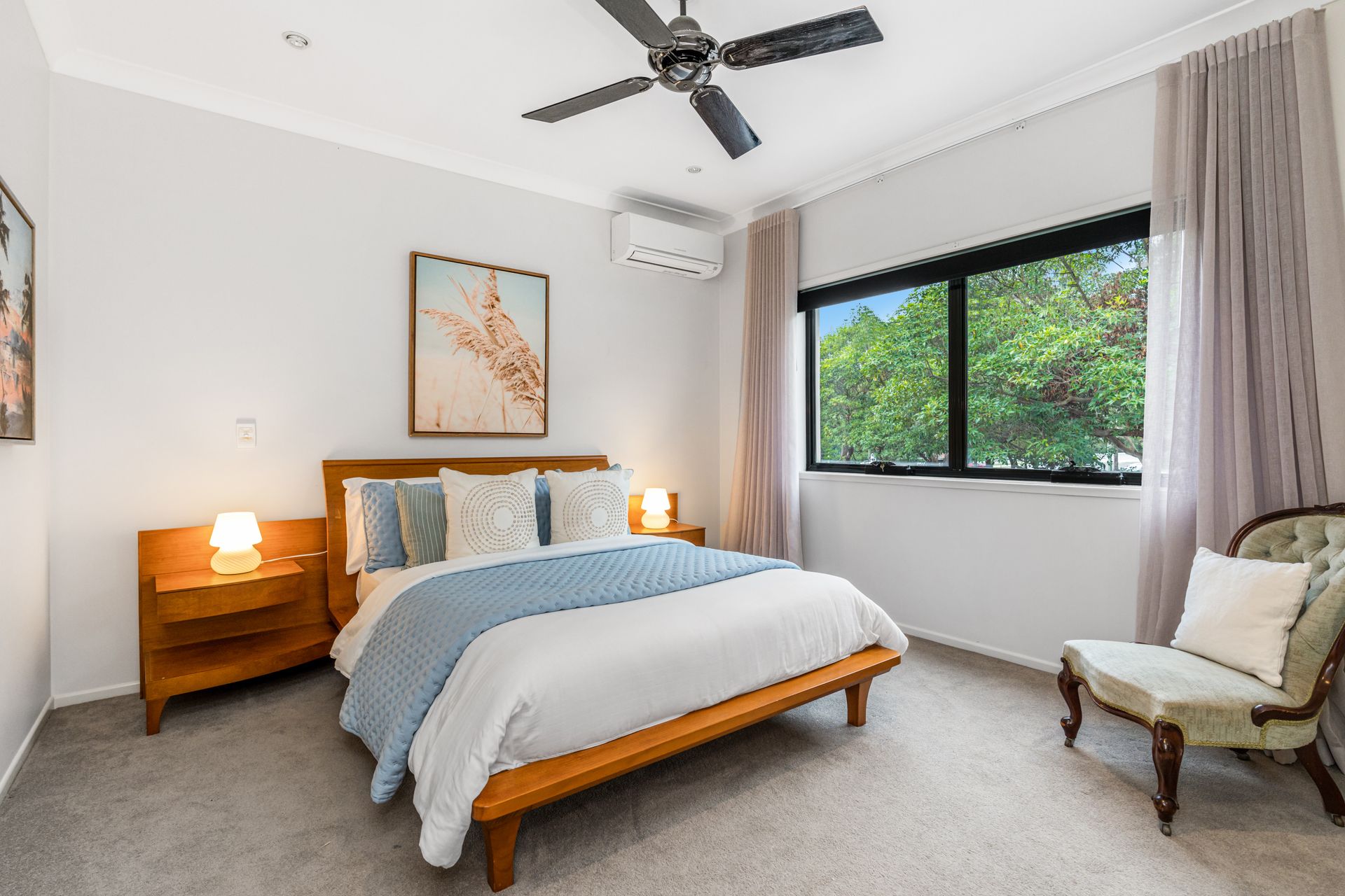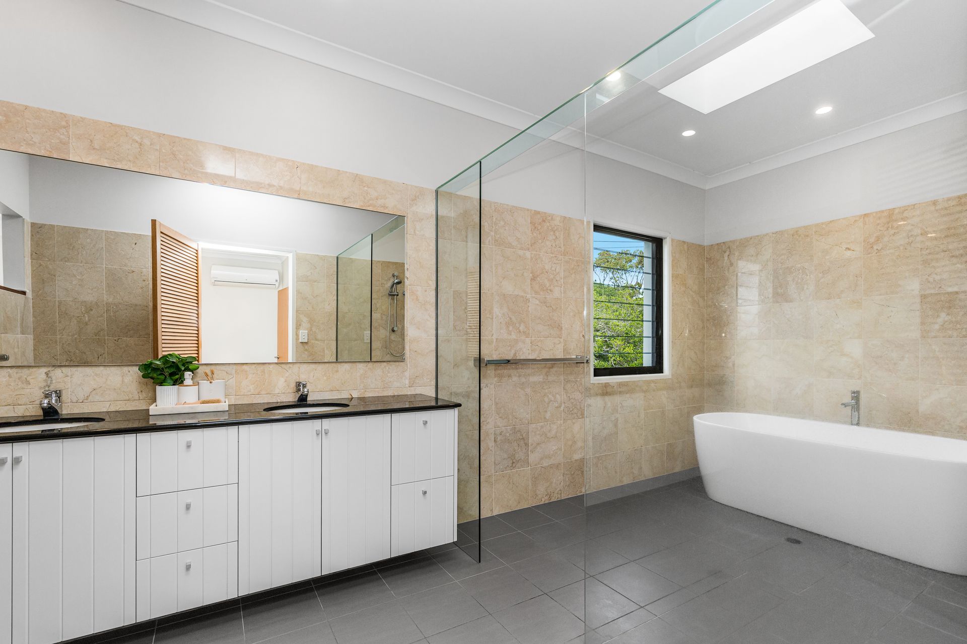 Three spacious bedrooms are located on this level, all with air conditioning and built-in robes. A large bathroom includes both a shower and bath, with a separate toilet for added convenience.