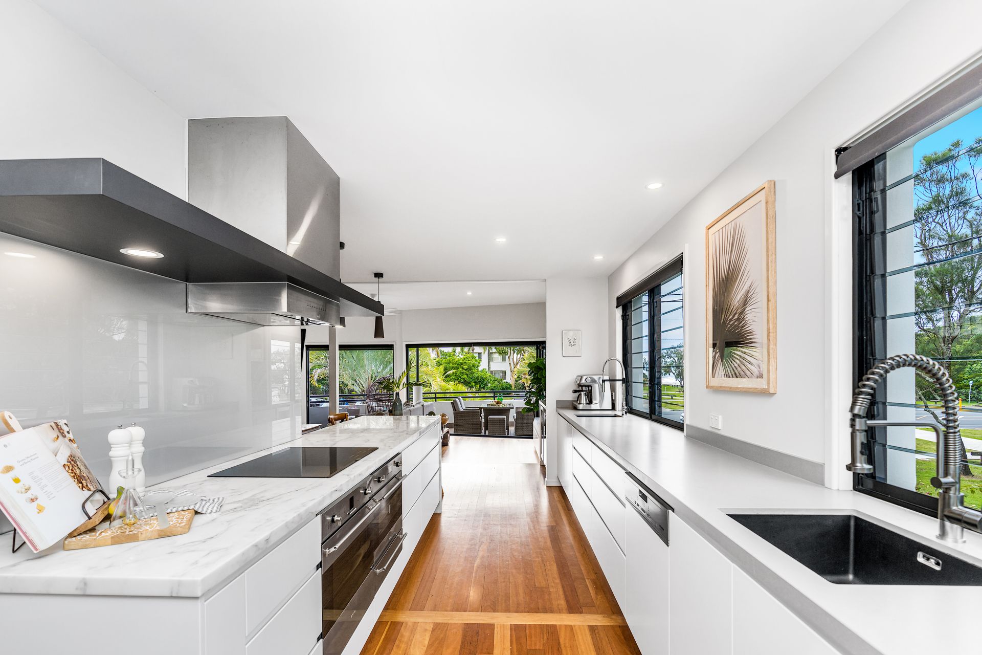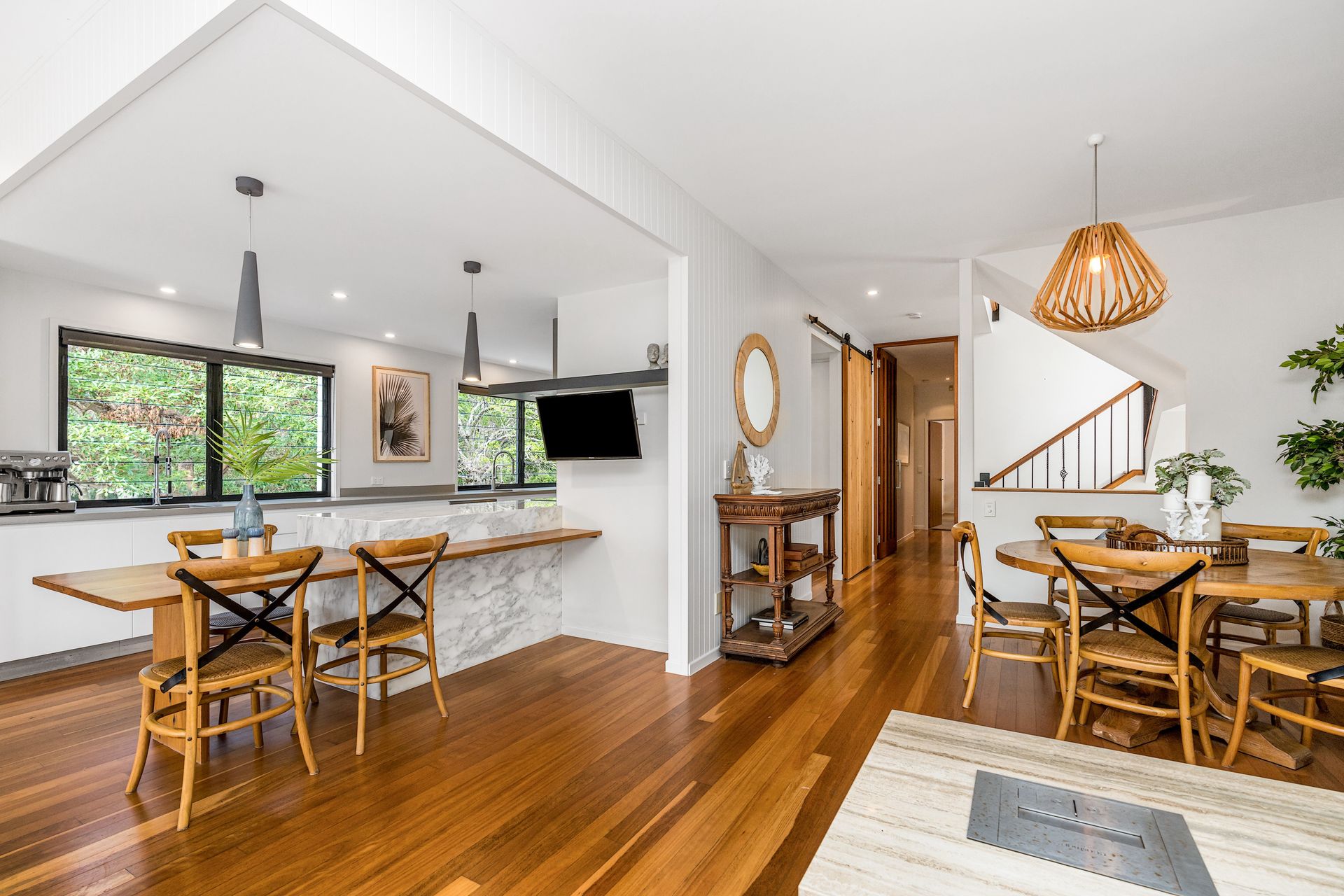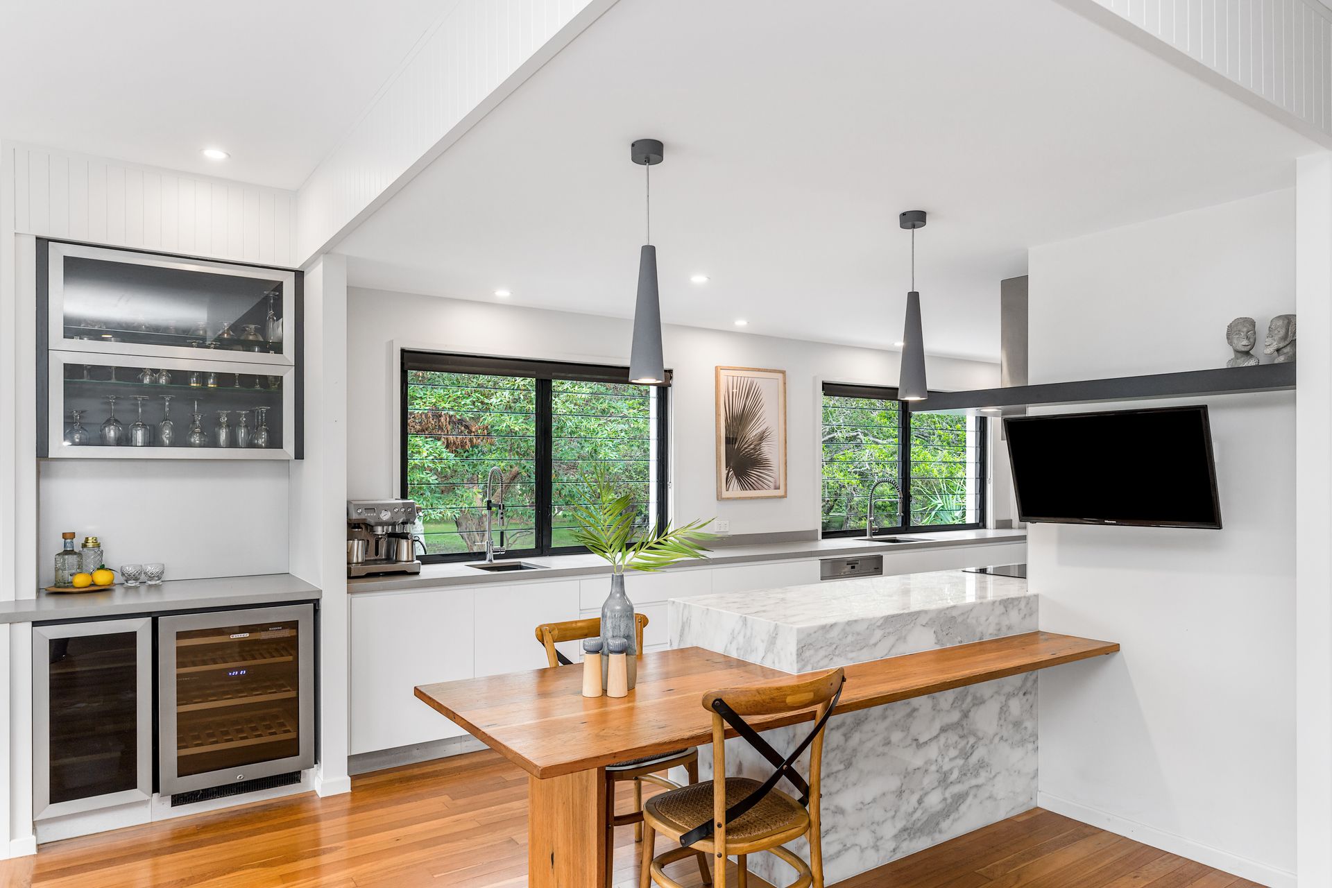 The heart of the home is the open-plan gourmet kitchen, complete with a galley-style layout, large pantry, coffee machine, double ovens, and full cooking essentials. A breakfast bench provides a casual dining option, while the spacious dining area is perfect for shared family meals.