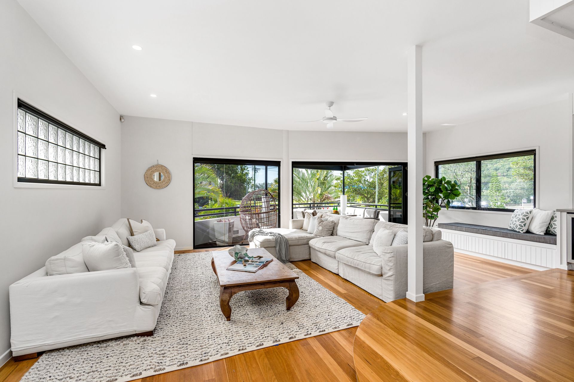 The living room offers comfortable seating, ocean views, TV with streaming services, ceiling fans, and refreshing sea breezes. A bay window with a day bed creates a peaceful nook for reading or relaxing.